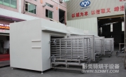 (8)烘干箱内可存放1辆推车。推车配置耐高温角轮(定向轮、万向轮各2个),推车里面安装限位柱用于定位里面托盘,两侧配有L形托架,用于支撑及左右限位托盘。进出口装有手动炉门。顶部部置循环风机、蒸气换热器等装置,排废风机安装在炉体顶部。