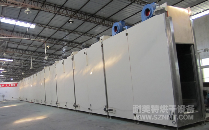 箱体内胆尺寸:宽0.9米*高2.9米*长40米; 箱体共分为10段,每段长度=4米,其中预热2段,烘干4段,程序降温3段,强制冷却1段;