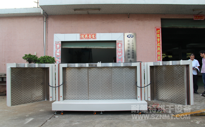 外形材质采用2mm厚冷板折弯而成,表面高温静电喷塑(非普通油漆)耐腐蚀,防生锈,外形尺寸:宽2.6米,深0.85米,高1.3米,双开门,配加强型镀铬方钢门锁,拉手,镀铬加强型合页,烤箱顶箱开有6个∮250孔.